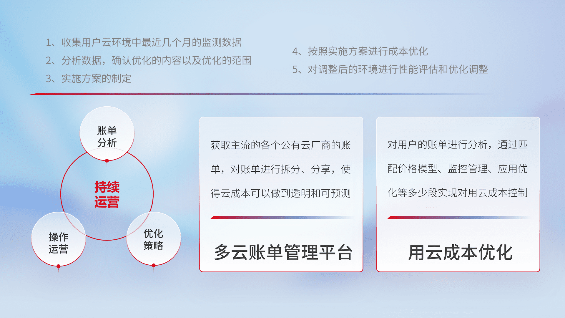 通过多云纳管,,,以统一的资源数据模型把客户的云资源进行抽象和封装,,,,进而实现对多云资源的统一操作,,,保障云资源管理的可靠性、、、稳定性与可用性。。。量身定制化运维内容,,,配置、、、、开发运维、、补丁管理、、备份、、监控、、、、认证和访问管理、、、审计和日常巡检等,,保障在用云过程中的可靠度,,稳定度以及高可用率。。。